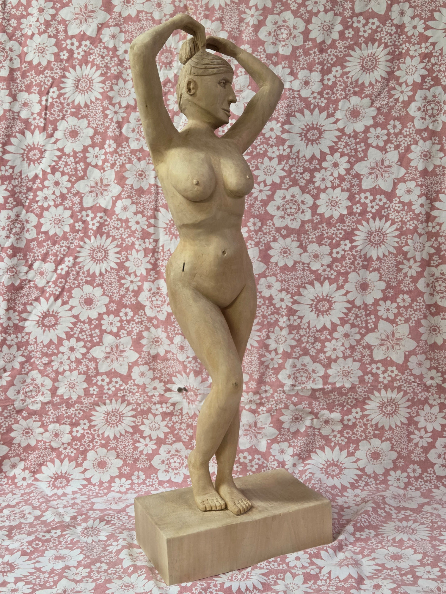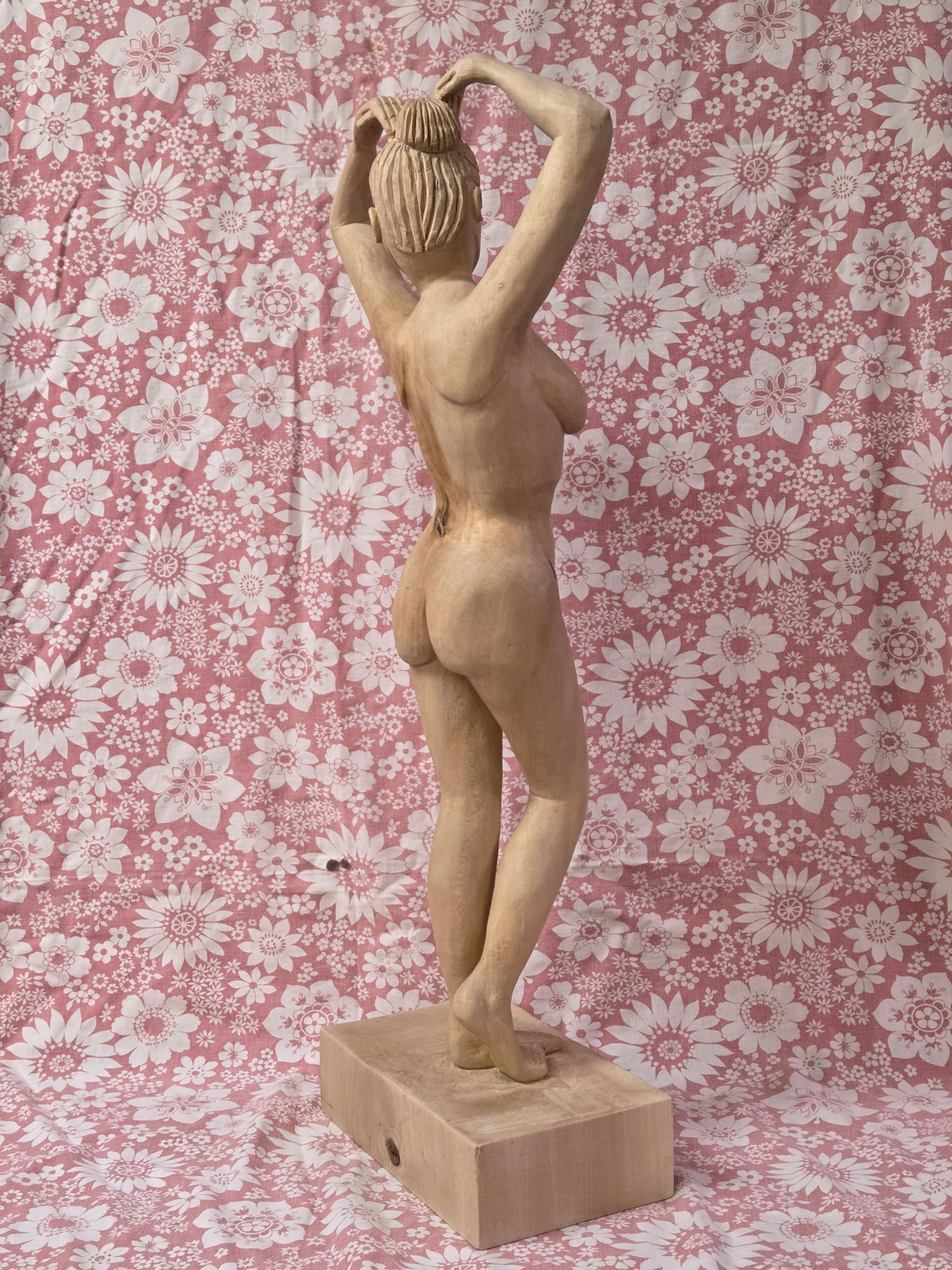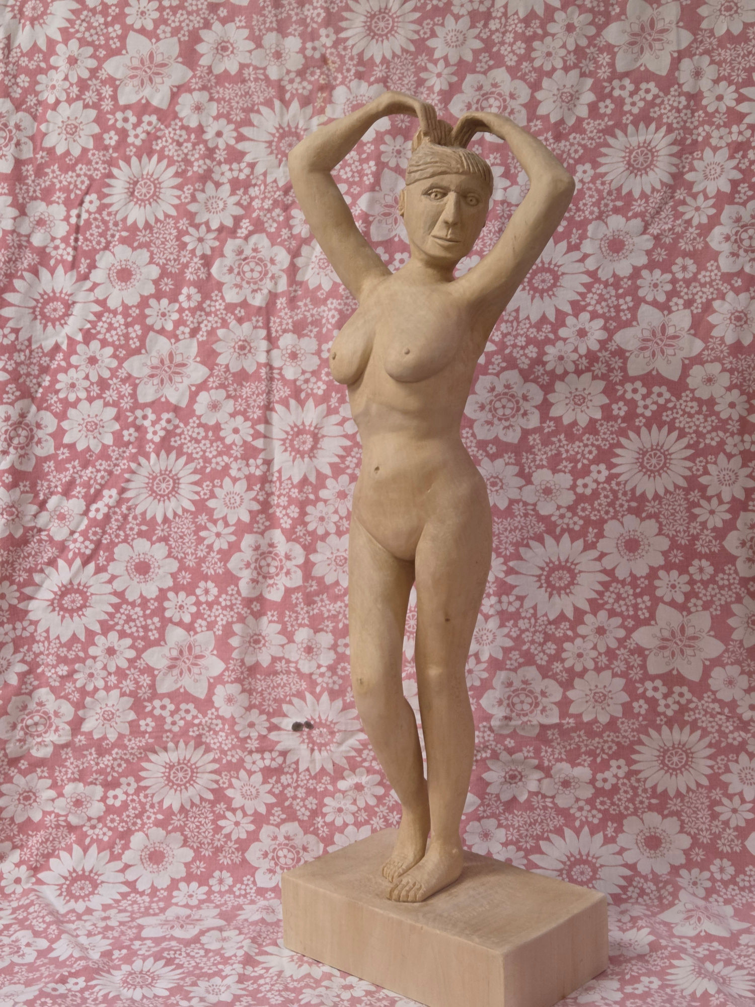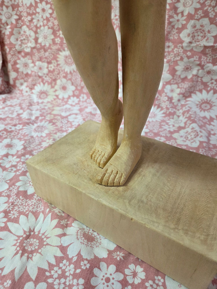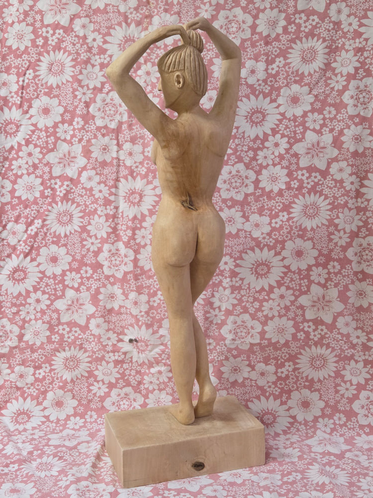 1: Book from Ian Norbury2: Front view and side view templates3: Rough basswood block hand planed to fit in planer, 22.4 kg4: Basswood block planed smooth5: Basswood block front and back planed parallel6: Basswood blank block ready for use, 10.4 kg7: Front template fitted on blank8: Left side template fitted on blank9: Right side and front traced on blank10: Front and left side traced on blank11: 9/16" auger drill bit12: Oak guide block with 9/16" perpendicular hole13: Holes next to feet for ease of band saw turning14: Holes between arms and head to ease excess wood removal15: Front of female statue cut out using the band saw, 5.1 kg16: Left side cut off is padded so that the top is horizontal when cutting of the excess17: Left side and back18: Left side and front19: Right side and front20: Right side and back21: Part of the waste; mind you that the left and right sides will be waste too after we have traced their shape onto the statue22: Preparing for the front for the excess wood removal23: Removal of excess wood at the lower front legs24: Front excess wood removal completed25: Unexpected rot revealed around left waist side26: Back waste removal completed27: The rot shows better now28: Almost done with rough wood removal29: Almost done with rough wood removal30: Rough rounded off forms31: Rough rounded off forms32: Finished rough rounded off forms33: Finished rough rounded off forms34: Finished rough rounded off forms35: Finished rough rounded off forms36: Finished rough rounded off forms37: Finished rough rounded off forms38: Finished rough rounded off forms39: Finished rough rounded off forms40: Finished rough rounded off forms41: Finished fine rounded off forms42: Finished fine rounded off forms43: Finished fine rounded off forms44: Finished fine rounded off forms45: Finished fine rounded off forms46: Finished fine rounded off forms47: Finished fine rounded off forms48: Finished fine rounded off forms49: Finished fine rounded off forms50: Lady Basswood high resolution (685 KB)51: Lady Basswood high resolution (608 KB)52: Lady Basswood high resolution (761 KB)53: Lady Basswood high resolution (819 KB)54: Lady Basswood high resolution (688 KB)55: Lady Basswood high resolution (798 KB)56: Lady Basswood high resolution (766 KB)57: Lady Basswood high resolution (825 KB)58: Lady Basswood high resolution (702 KB)59: Lady Basswood high resolution (764 KB)60: Lady Basswood high resolution (432 KB)61: Lady Basswood high resolution (577 KB)