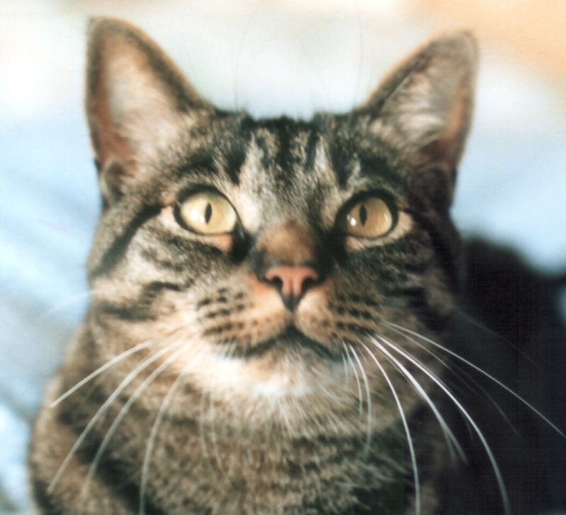 Stranger was a stray domestic cypress tabby. Came to our door in Houston begging for food. I tossed a slice of bread to her outside and she finished that in no time. She kept coming back every day and we kept feeding her. Of course with our two sons around, very soon she was allowed to come inside during the day. After several months the "winter" started in Houston (ha, ha), and we decided to keep the stray cat. We had her checked and vaccinated by the veterinarian and named her Stranger. The veterinarian estimated that she was born mid 1980 and she came to us mid 1981. She traveled all over the world with us from Houston, Texas, to Lisse, Netherlands, to Durban, South Africa, back to Lisse, and finally to Calgary, Alberta. She recovered from her first stroke, but her personality had changed completely. After the second stroke she could not function anymore and we had to let her sleep in on 15-Jan-1997.